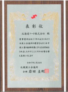 北海道フードのホームページにアクセスいただき誠にありがとうございます。 この度、札幌商工会議所 令和6年度 永年会員40年目として表彰をいただきました。 今まで大変困難な時期もありましたが、皆様のお力添え、多大なるご支援 […]