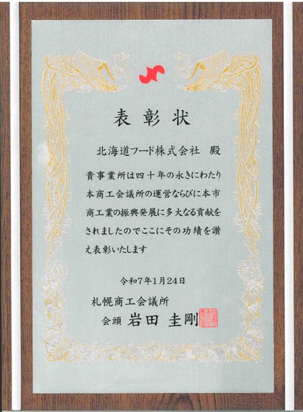 この度、札幌商工会議所 令和6年度 永年会員40年目として表彰をいただきました。